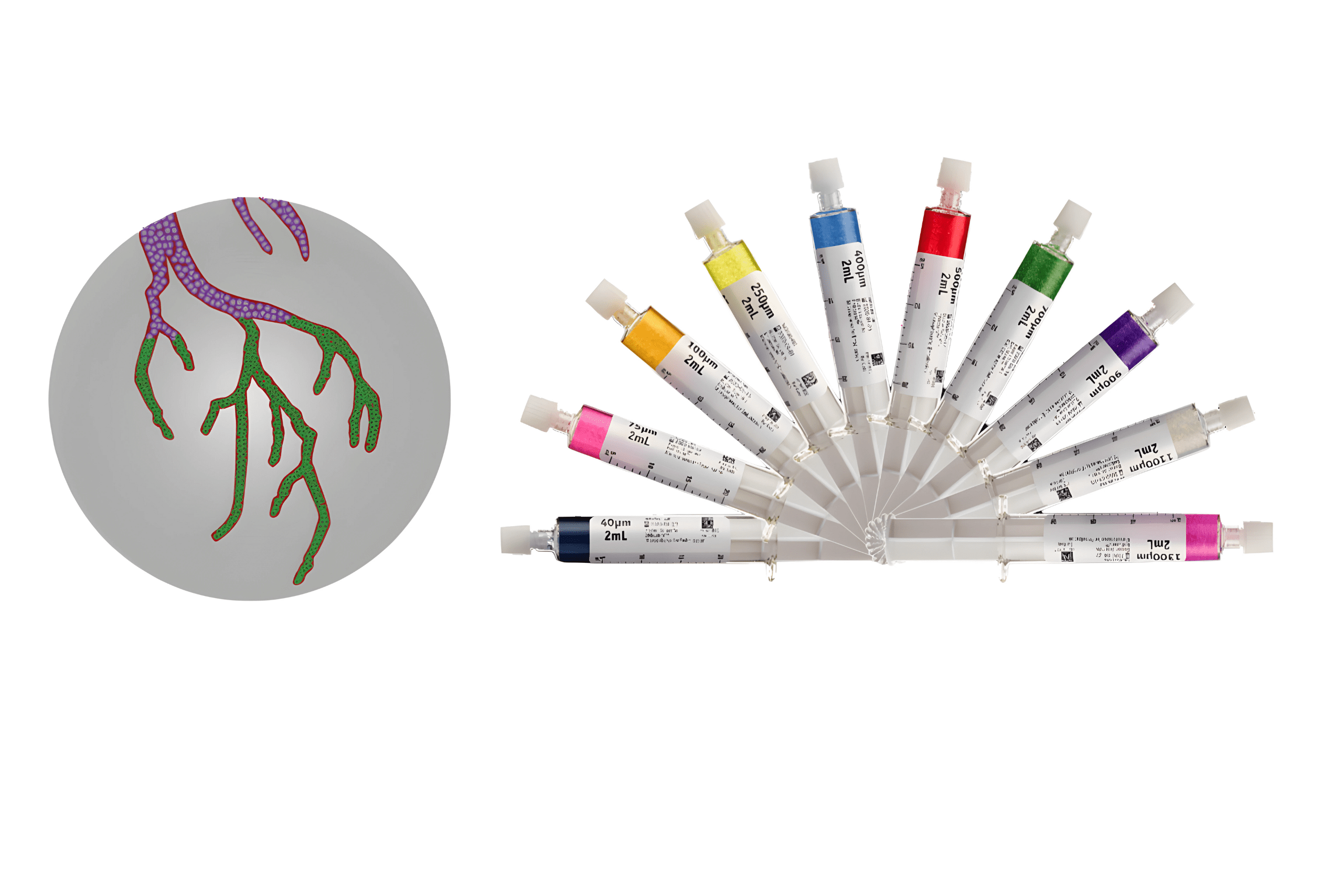 • ≥95% das microesferas Embozene estão dentro da faixa de tamanho especificada, resultando em maior confiança ao realizar procedimentos de embolização superseletivos e direcionados